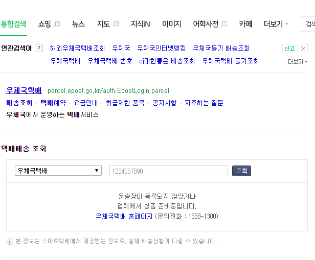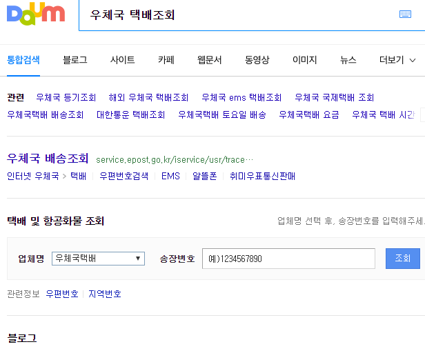 포털에서도 검색을 하면 마찬가지로 숫자를 입력하는 부분이 나오는데, 빈칸을 적당히 채우고 버튼을 누르면 우체국 택배를 조회 결과가 나올 것입니다.