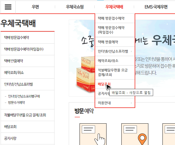 페이지를 찾아가면 왼쪽과 상단에 정리된 메뉴들이 보일 거예요. 그리고 그 중에서 우체국 택배를 조회하는 메뉴도 보일 것입니다. 물론 클릭하면 됩니다.