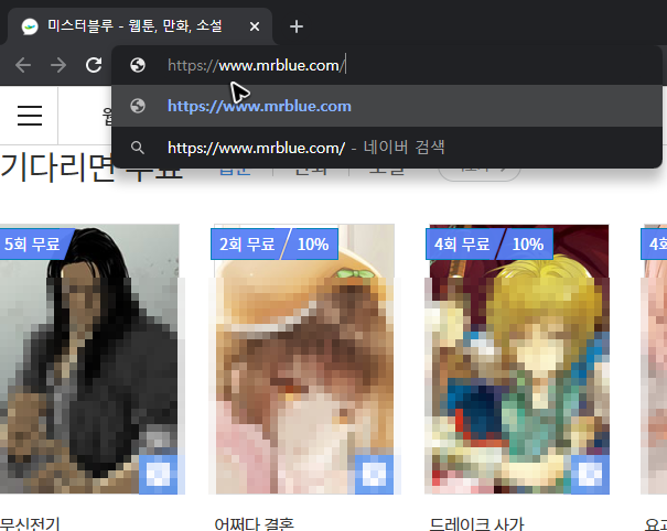 우선 사이트를 찾아가는 것부터 얘기를 하자면 워낙 큰 덩치(?)를 자랑하는 곳이라 그냥 포털에서 검색하면 됩니다. 아니면 [mrblue.com]를 주소창에 입력해서 미스터블루의 만화와 무료쿠폰이 있는 곳으로 찾아갈 수도 있는데, 편한 방식으로 찾아가시면 될 것 같아요.