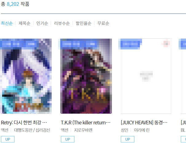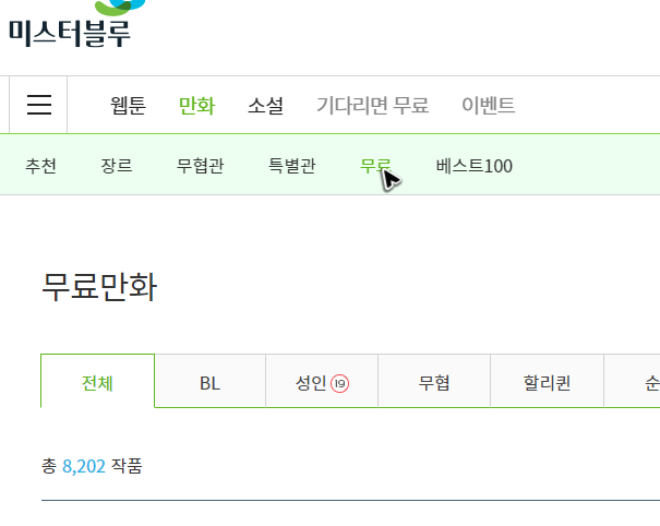 메뉴를 누르면 8천 작품이 넘는 책들이 나오는데, 전권이 완전히 공짜는 아니지만 이렇게 일부라도 공짜인 책들을 위주로 읽어보신다면 정말 미스터블루 만화를 볼 가치가 있는 책들을 추려내는데 도움이 될 수 있을 것입니다. 보통 기호에 맞는 만화는 시작부터 느낌이 오는 경우가 많죠?