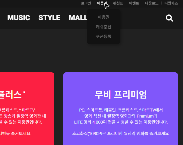 다만, 로그인을 하면 tvn 온에어의 무료를 스트리밍할 수 있는 것은 맞지만, 화질을 최대 720까지만 선택할 수 있어요. 이 화질을 넘는 수준으로 시청을 하려면 추가적으로 등록을 해야 하는데, 저는 720도 충분히 보기 괜찮은 것 같아서 따로 추가 등록을 하지는 않았습니다. 혹시 추가 등록을 알아보고 싶으시다면, 우측 상단의 이용권을 클릭해주세요. 그럼 관련 정보를 열람할 수 있습니다.
