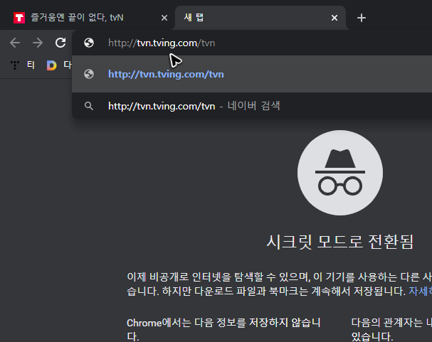 앞에서 뭔가 거창하게 얘기를 한 것 같은 느낌인데, 사실 tv 실시간 스트리밍을 하는 것은 채널에서 공직 지원을 해주는 서비스 중에 하나입니다. 고로 우리는 채널 사이트만 찾아가면 되는데, 검색하거나 주소창에 [tvn.tving.com]를 입력해서 tvn의 온에어를 무료로 보는 곳으로 이동하면 됩니다.