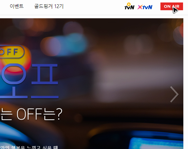 공식 사이트를 찾아간다고 해도 라이브를 스트리밍하는 곳이 바로 보이지는 않을 거예요. 그래서 tvn 온에어의 무료를 보려면 메뉴를 눌러야 합니다. 우측 상단을 확인해주세요. 그럼 ON AIR라 적힌 버튼이 있는데, 그 버튼을 누르면 플레이어가 있는 곳으로 이동을 하실 수 있을 거예요.