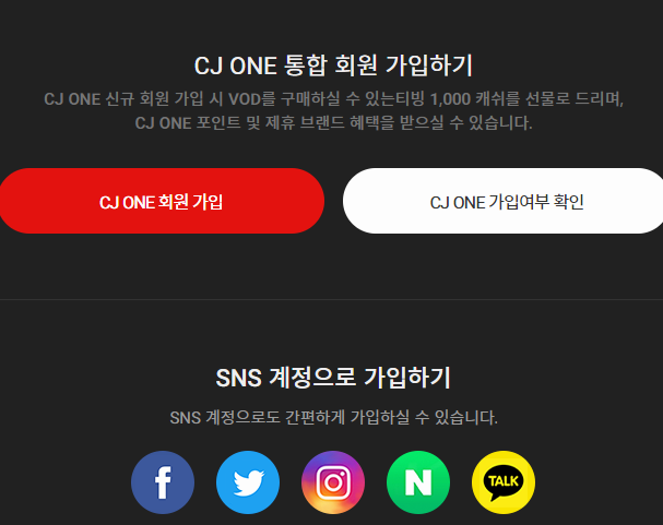 회원가입 버튼을 누르면 다양한 방식을 지원하고 있는 것을 보실 수 있을 거예요. 이 중에서 편한 방식으로 회원가입을 하면 됩니다. 어떤 방법이 됐든, 특별히 복잡하거나 까다롭지 않아서 무난하게 tvn의 온에어를 시청하실 수 있을 거예요.
