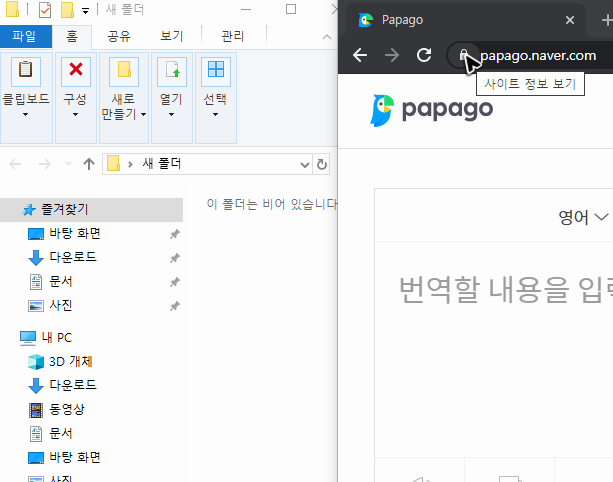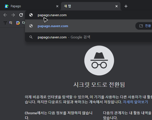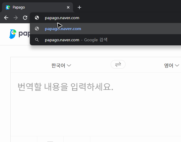 그리고 주소창 왼쪽 부분을 드래그하며 밖으로 꺼내주면 네이버 번역기 파파고의 바로가기를 하는 버튼이 생성되는 것을 확인할 수 있을 것입니다.