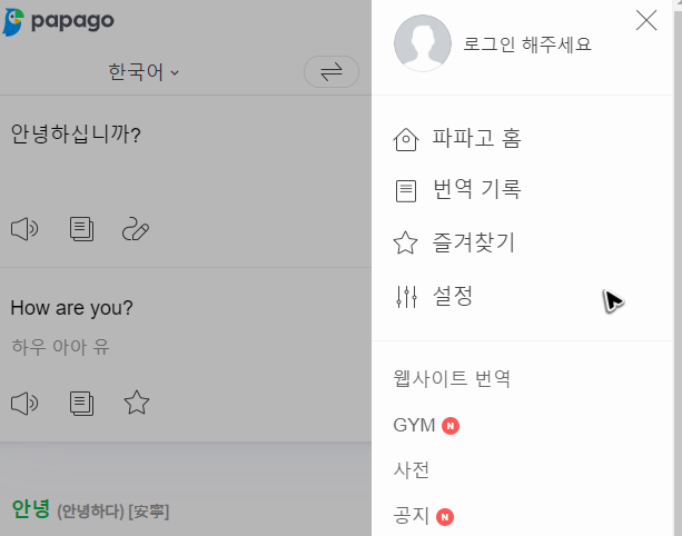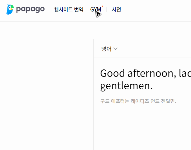 그리고 혹시 네이버 번역기 파파고의 바로가기를 해서 사용하는데, 기능적인 부분이 발전할 수 있도록 도움을 주고 있으시다면, 왼쪽 상단에 있는 GYM이라 적힌 메뉴를 눌러주세요. 그럼 네이버 번역기의 파파고에 변환 능력을 높일 수 있도록 데이터 입력에 참여할 수 있습니다.