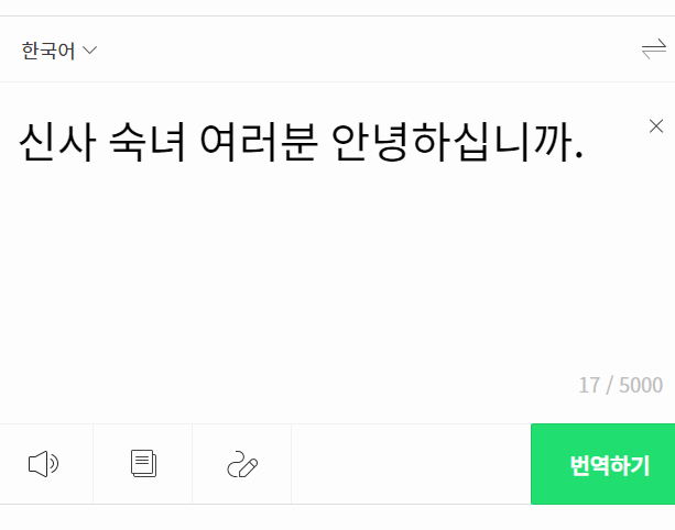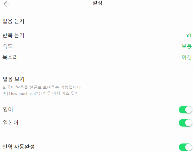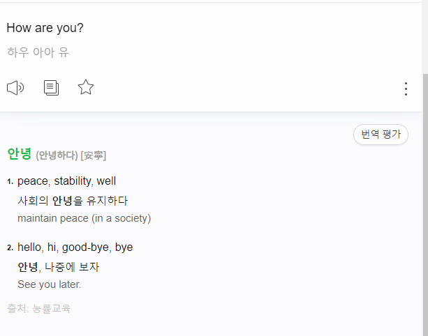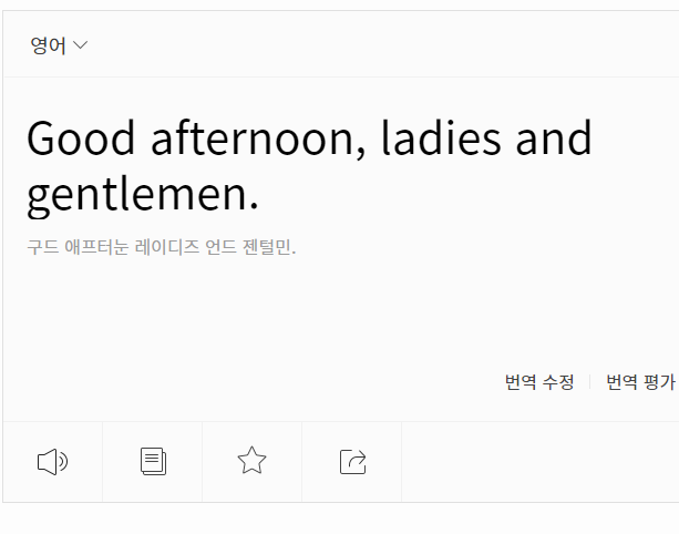 저도 이번에 네이버 번역기의 파파고로 간단한 인사말의 변환을 해봤어요. 다른 도구와 달리 사전 기능도 함께 안내를 해주고 있어서 요긴한 것 같습니다. 우측 상단의 가로 세 줄이 그어진 버튼을 누르면 추가 기능을 활용할 수 있고, 스피커 모양의 버튼을 누르면 발음을 들을 수도 있습니다.
