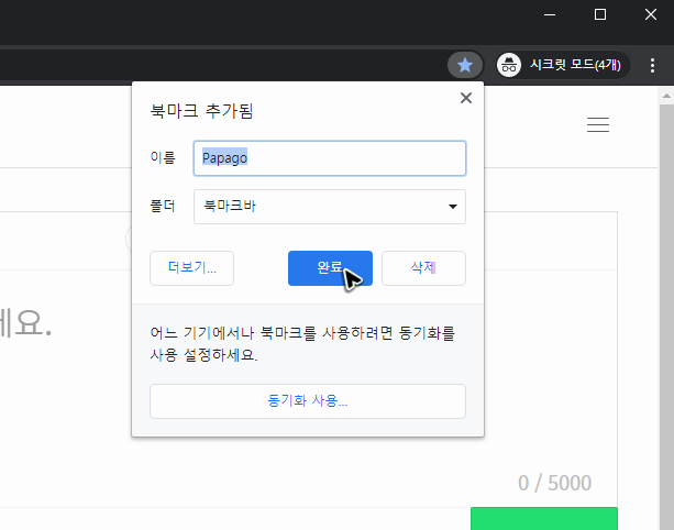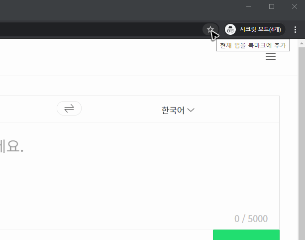 물론 크롬의 변환이 능사는 아닙니다. 기호에 따라 네이버 번역기 파파고의 바로가기를 하는 것이 더 편할 수도 있어요. 즉, 북마크에 네이버 번역기 파파고를 추가해두는 것이 더 편할 수도 있습니다. 혹시 북마크에 추가해서 사용하고 싶으시다면, 주소창 오른쪽에 있는 별표 모양의 버튼을 누르고 이름을 지정해주시면 됩니다.