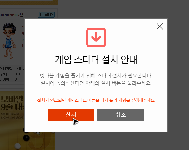로그인을 하면 넷마블의 장기를 실행하거나 설치하는 화면이 나오지 않고, 다시 처음의 화면이 나올 거예요. 여기에서 다시 한 번 대국실 입장 버튼을 누르면 됩니다. 그럼 설치 안내 화면이 나오는데, 주황색 버튼을 눌러서 설치 과정을 시작해주세요.