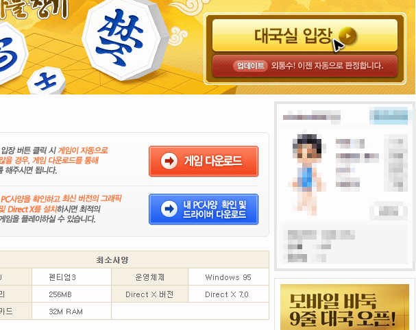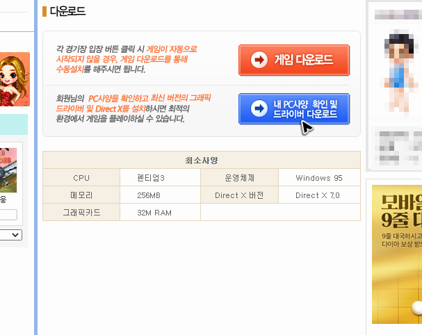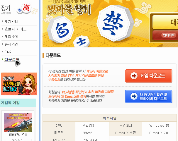 여담으로 사이트의 왼쪽에서 다운로드라 적힌 카테고리 메뉴를 누르면, 별도로 넷마블의 장기를 받는 것이 가능하고, PC 사양을 확인하는 툴을 받는 것도 가능한데, 사실 요즘에는 특별히 사용할 필요가 없는 버튼인 것 같아요.
