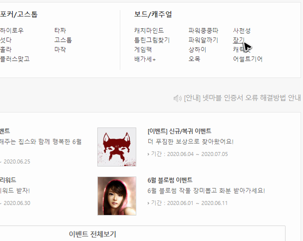 주소를 정확하게 입력해서 사이트를 찾아가더라도 넷마블의 장기가 보이지는 않을 거예요. 그저 다양한 온라인 게임 목록만 보이는데, 마우스 휠을 굴리면서 아래쪽으로 이동하면 됩니다. 그럼 보드 및 캐주얼이라 적힌 그룹이 있고, 그 안에 제목의 게임도 보일 거예요. 정확한 메뉴 위치는 하단 그림에서 커서가 있는 곳을 확인해주세요.