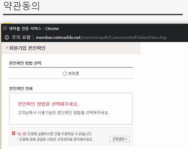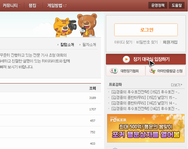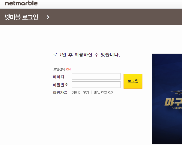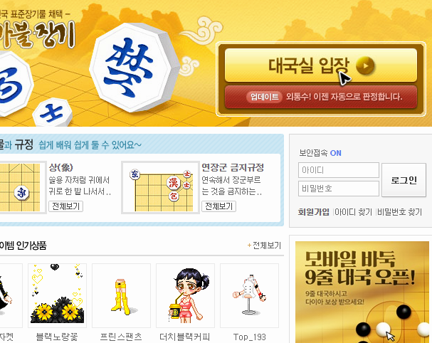 메뉴를 눌러서 넷마블의 장기가 있는 전용 페이지로 이동하면, 대국실 입장이라 적힌 버튼이 보일 거예요. 그 버튼을 누르면 로그인 화면으로 연결이 되는데, 설치를 위한 필수 과정이니 로그인을 해주셔야 합니다.