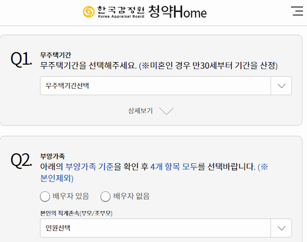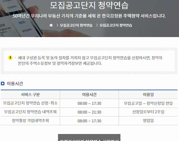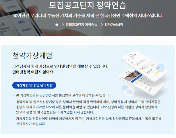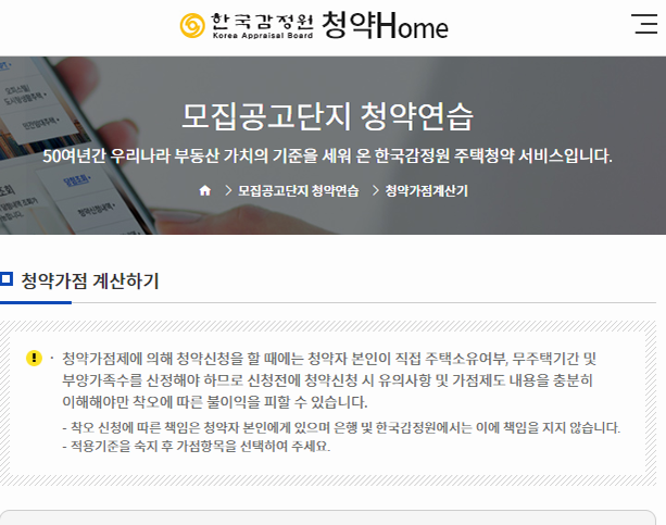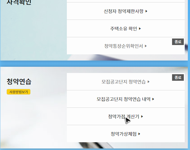 아마 처음으로 해당 사이트를 찾아오신 분들이라면 가점계산을 하거나, 가상체험을 해보시려는 경우가 많으실 거예요. 해당 기능은 연습 그룹에 정리되어 있는데, 각각의 메뉴를 누르고 상세 사이트로 이동한 뒤에 질문에 답을 하면 원하는 결과를 확인할 수 있습니다.