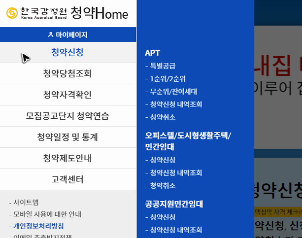 메인 화면을 보면 중간에는 자주 찾는 기능들이 준비되어 있고, 왼쪽에는 사이트에서 제공해주는 모든 기능들이 담긴 메뉴들이 정리되어 있습니다. 우선 청약홈의 홈페이지에서 중간 영역에 있는 자주 찾는 메뉴들부터 확인을 해주세요. 필요한 기능을 바로 찾을 수 있을 것입니다.